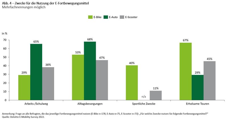 In der jüngsten Studie zur E-Mobilität nahm Deloitte die Nutzungshäufigkeit, die Motive und den Zweck der Fahrten mit verschiedenen elektrischen Verkehrsmitteln sowie die dabei zurückgelegten Distanzen unter die Lupe.