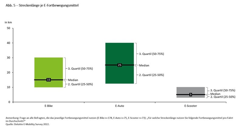 Bezüglich der pro Fahrt zurückgelegten Strecke liegen Elektrovelos zwischen E-Autos und E-Trottinetts. Weil schnelle E-Bikes in Deutschland wegen der strengen Gesetzeslage weit weniger verbreitet sind als in der Schweiz, dürfte der Wert hierzulande höher ausfallen – beziehungsweise der Anteil der E-Bike-Pendlerinnen und -Penlder, die jeden Tag 30 Kilometer oder mehr zurücklegen.